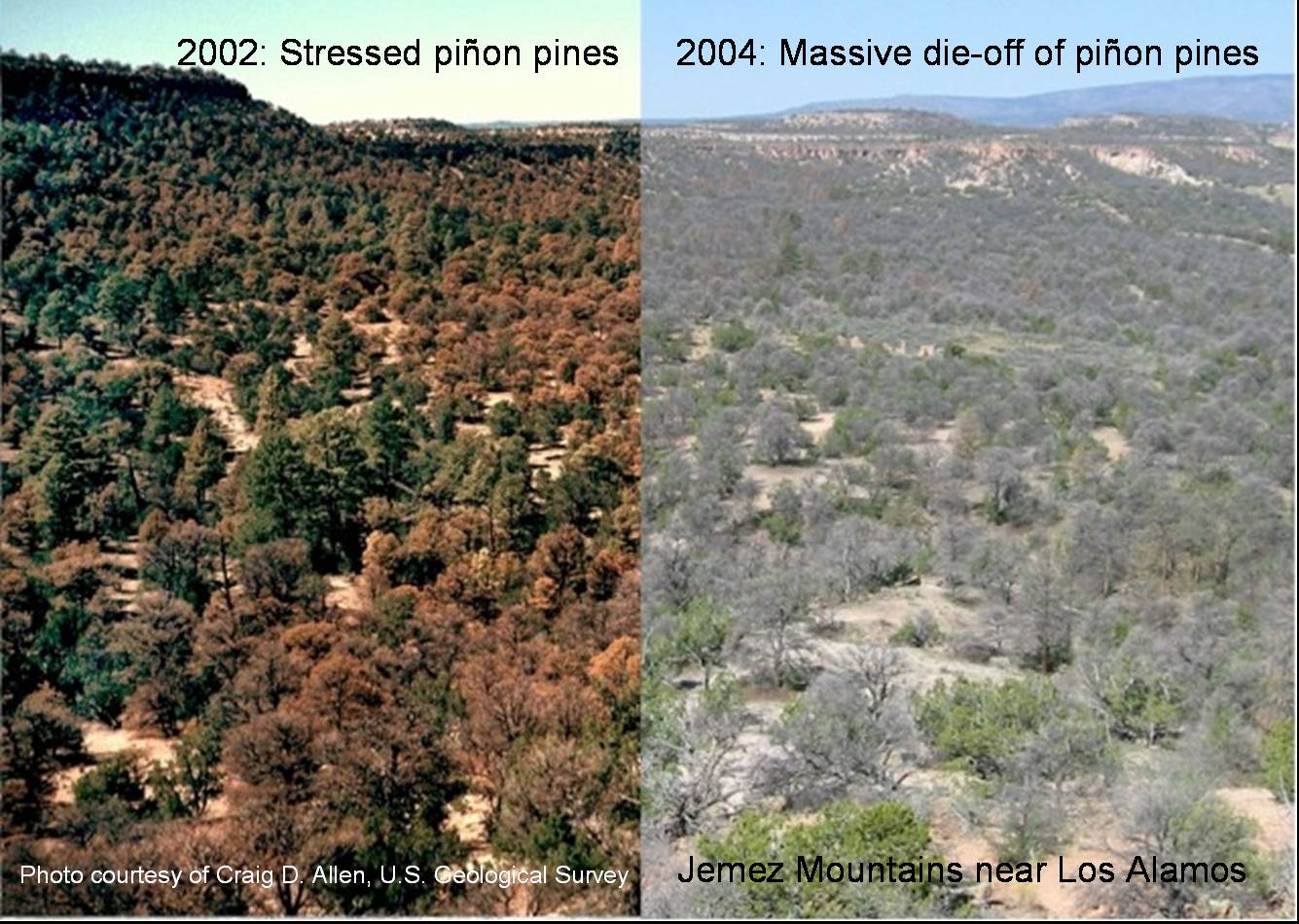 На снимке слева, сделанном в 2002г., изображены сосновые леса близ Лос-Аламоса, штата Нью-Мексико, хвойный покров которых начал темнеть и приобретать коричневый оттенок вследствие воздействия засухи, на другом снимке, справа, сделанном уже в 2004 г. с той же самой позиции, видно, что ситуация значительно ухудшилась - ранее засыхающие леса выглядят совсем безжизненными. (Фотографии представлены Крейгом Алленом, Служба геологической съёмки США).
