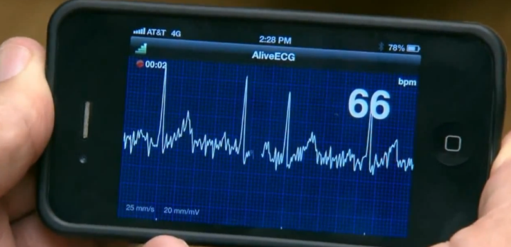 Нарушения сердечного ритма встречаются не так часто, как рефракционные аномалии, но тоже могут быть выявлены с помощью смартфона. Ежегодно в США делается около 12 млн кардиограмм, и это гораздо меньше реально необходимого числа. Большинство пациентов просто не обращаются за медицинской помощью в силу разных причин. Улучшить ситуацию поможет беспроводной электрокардиограф компании AliveCor, который подключается к iPhone и отображает кардиограмму на его экране.