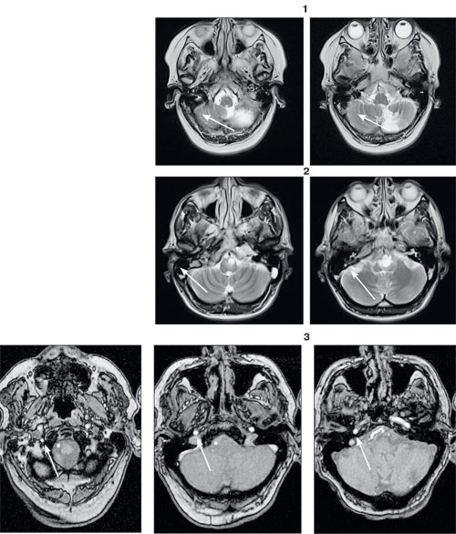 Данные магнитно-резонансной томографии. Инфаркт мозжечка (1), опухоль ствола головного мозга (2), закупорка позвоночной артерии (3) сопровождаются головокружениями.