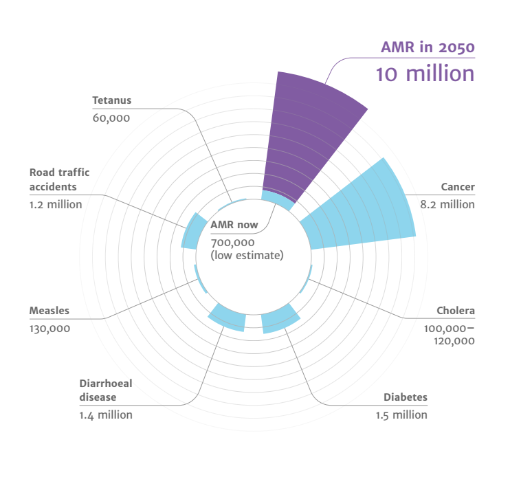 Глобальную ежегодную смертность от наиболее распространенных лекарственно-устойчивых штаммов инфекций оценивают минимум в семьсот тысяч человек. Если ситуация не поменяется, то сто миллионов человек к 2030 году преждевременно умрут, а через тридцать пять лет эта цифра достигнет трехсот миллионов. Мировая ежегодная смертность из-за антибиотиковой резистентности достигнет к 2050 году десять миллионов.