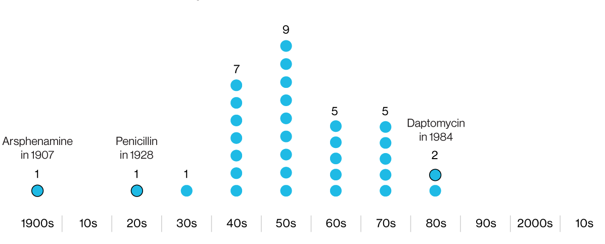 Человечество тысячелетиями сражалось с микроорганизмами. Первый антибиотик — пенициллин — был открыт в 1928 году британцем Александром Флемингом. Широко использовать в клинике данную группу лекарств начали только в 1940-х годах. Следующие двадцать лет называют золотой эрой антибиотиков, но современем темп открытий сошел на нет, и в настоящий момент антибактериальных лекарств, которые попадают на рынок, очень мало.