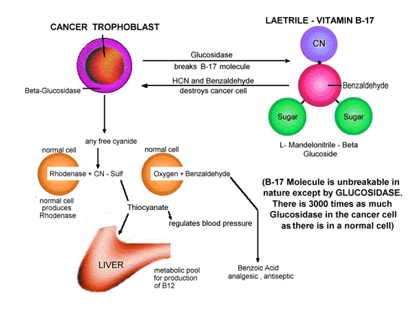 Злокачественая клетка, в сравнении с этим, не только имеет большую концентрацию отпирающего фермента, чем любая нормальная клетка, но также обладает дефицитом защитного фермента. Таким образом, она особенно уязвима для выпущенных цианида и benzaldehyde.