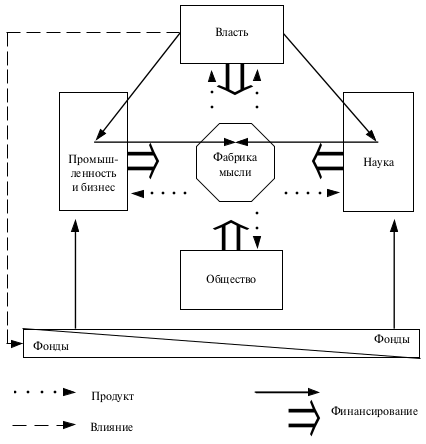 Американская модель организации "фабрик мысли" обладает неоспоримыми достоинствами. Успешно пользующиеся заинтересованностью правительства США в развитии и расширении научно исследовательского потенциала, однако привлекающие, наряду с государственными, значительные ресурсы общественных и бизнес структур и умело маневрирующие ими, "фабрики мысли" в США представляют собой в высокой степени самостоятельные организации, приближенные к власти, но не включенные в нее непосредственно (в отличие от того, что часто имеет место, например, в российской ситуации). Такая "трехмерная"система способствует выработке адекватных управленческих рекомендаций, отвечающих критериям достоверности и функциональности.