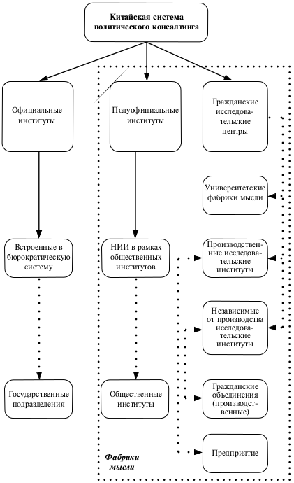 В систему входят официальные институты, полуофициальные институты и гражданские исследовательские центры. Внешне возникает иллюзия некоего подобия американской модели, однако при формальном совпадении ряда ключевых акторов отсутствует развитая система фондового спонсорства и получения негосударственных заказов. "Фабрики мысли" в КНР используются официальными структурами прежде всего как поставщики проверенной и обобщенной информации о тех социальных группах, с которыми они связаны.
