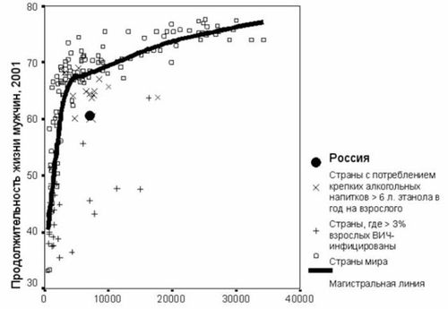 Как считает заместитель директора ИПМ РАН, мы проходим кризис наихудшим образом из всех возможных. Кризис в верхах рассматривают, как какое-то стихийное бедствие, а единственную надежду видят в том, чтобы дождаться благоприятной конъюнктуры на мировых рынках сырья. Пожалуй, самая важная инновация для РФ сегодня заключается в том, чтобы научить нашу элиту таблице умножения. Чтобы достигнуть подобия макроэкономической стабилизации, правительство истратило 200 миллиардов долларов, треть финансовых резервов страны. И все равно безработица к концу 2009-го ожидается на уровне 10 миллионов человек. Но на эти же двести миллиардов можно было создать 10 миллионов рабочих мест со средней зарплатой в 20 тысяч рублей, причем на три года. На кризис экономический наслаивается кризис демографический. Парадокс: но социально-экономическая система в РФ такова, что наши граждане живут в среднем на 10 лет меньше, чем должны были бы жить при существующем уровне ВВП на душу населения. Россия здесь выбивается из глобального графика, показывающего зависимость средней проложительности жизни от ВВП per capita.