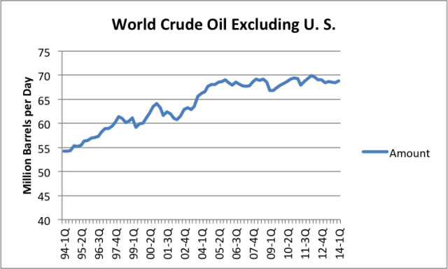 Однако всё становится ещё сложнее, поскольку американская глобальная империя в конечном счёте основана на углеводородном сырье – в основном нефти – и контроле над ним. Финансовый аналитик Гейл Тайберг отмечает, что если вычесть увеличение поставок нефти в связи с добычей сланцевой нефти в США, из общего мирового производства сырой нефти, получается следующий результат: