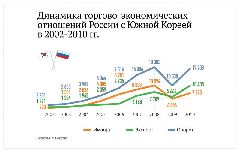 азиатским финансовым кризисом, а затем не менее резкий восстановительный рост. С начала 2000-х гг. страна демонстрирует устойчивые темпы прироста ВВП в среднем на уровне 4,5% в год. Мировой финансовый кризис негативно сказался на корейской экономике, однако ей удалось сохранить рост ВВП в 2009 г., но лишь на уровне 0,3%. Прирост ВВП в 2010 г. составил 6,2%. ВВП по ППС на душу населения в Корее – один из самых высоких в Азии (31,7 тыс. долл.) и 29-й в мире. С 2000 по 2010 г. он вырос почти на 70%, а с 1990 г. – в 3,6 раза. Экономика Кореи – одна из самых высокотехнологичных в Азии. Так, среди основных отраслей специализации значатся высокотехнологичная электроника, автомобиле – и судостроение. Корея является активным участником международной торговли. Ее товарооборот составляет 1063,3 млрд. долл., причем с 1990 г. он вырос более чем в 9 раз. И по объему экспорта (547 млрд. долл.), и по объему импорта (516,3 млрд. долл.) Корея входит в число ведущих пятнадцати государств мира. Численность населения в Корее в последние 20 лет находится на стабильном уровне, средний ежегодный прирост в 1990-е гг. составил 0,9%, а в 2000-е гг. – 0,3%. Численность населения Кореи – 49 млн. чел.