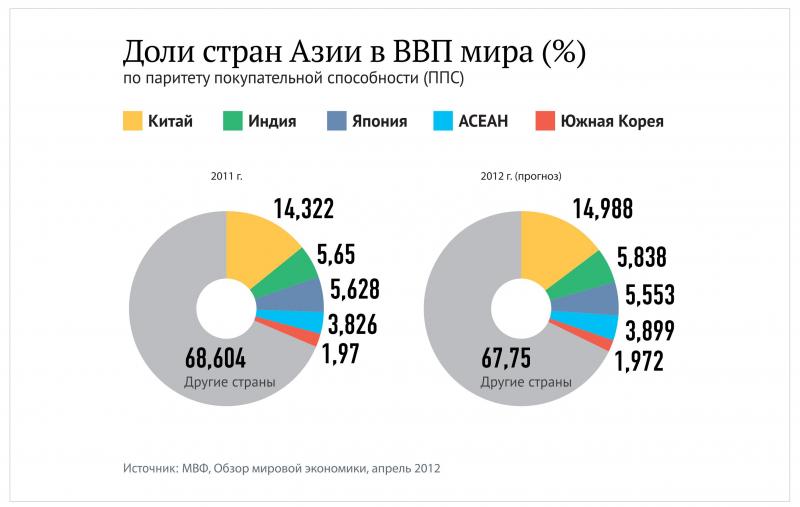 Только азиатские страны смогли сохранить высокие темпы роста в ходе мирового финансово-экономического кризиса, начавшегося в 2008 г., став основным локомотивом по выводу мировой экономики из рецессии. Очевидно, что они и в дальнейшем будут расти, хотя, вероятно, и с замедлением. Если в настоящее время на ВВП стран Азии