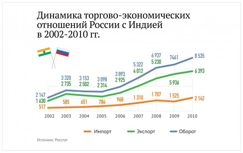 1.2.13. Сейчас ВВП Индии составляет 1,68 трлн. долл., по этому показателю страна занимает 11-е место в мире. По ВВП по ППС (4,4 трлн. долл. 2011 г.) Индия занимает 4-ю позицию. С 1990 по 2008 г. он вырос в 5,5 раз – средний ежегодный прирост ВВП составлял более 6%. При этом последний этап роста начался в 2003 г., когда в течение пяти лет индийская экономика росла более чем на 8% в год. Кризис замедлил рост ВВП до 4,9% в 2008 г., однако уже в 2009 г. произошло возвращение к высоким темпам роста – 6,7% . Темп роста ВВП в 2010 г. достиг 10,6%. За последние 20 лет Индия существенно увеличила свою долю в валовом объеме международной торговли. С 2000 по 2010 г. объем экспорта увеличился в 6,1 раза, с 1990 по 2010 г. – в 16,5 раз. Увеличение объема импорта за эти же периоды составило, соответственно, 3,6 и 12,9 раза. За один лишь 2010 г. экспорт вырос по сравнению с 2009 г. на 36%. Внешнеторговый оборот с 1990 по 2010 г. вырос в 15,4 раза.