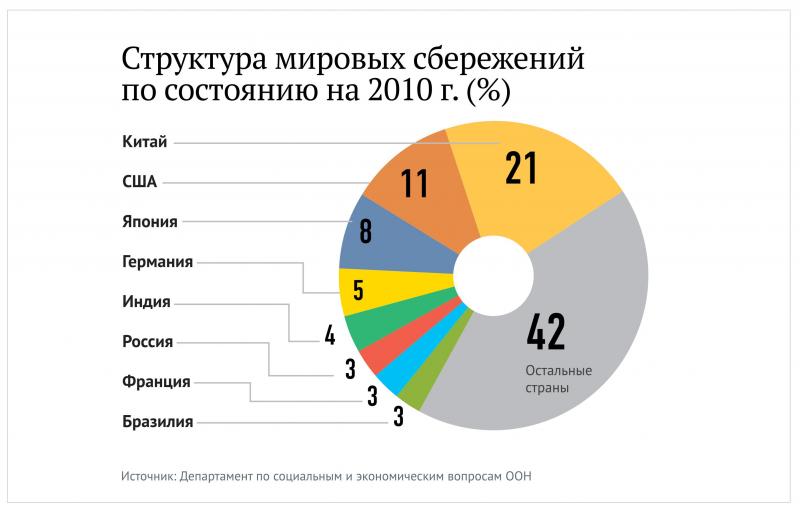 1.2.3. Что касается валовых сбережений, которые на практике определяют инвестиционный потенциал, то и здесь азиатские страны также занимают лидирующие места. Первое место с колоссальным отрывом принадлежит Китаю (3 064 млрд. долл., доля – 20,7%). Помимо него в десятку стран, располагающих наибольшими валовыми сбережениями в абсолютном выражении, входят Япония (3-е место, 1 167 млрд. долл.), Индия (5-е место, 545 млрд. долл.) и Южная Корея (10-е место, 324 млрд. долл.). На эти четыре азиатские страны приходится 34,5% совокупных мировых сбережений. Для сравнения, доля Европейского союза – 21,4%, США – 11,3%. Помимо абсолютных показателей, Китай и Индия демонстрируют очень высокие относительные показатели: доля сбережений в ВВП этих стран в 2010 году составила 53% и 34%, соответственно.