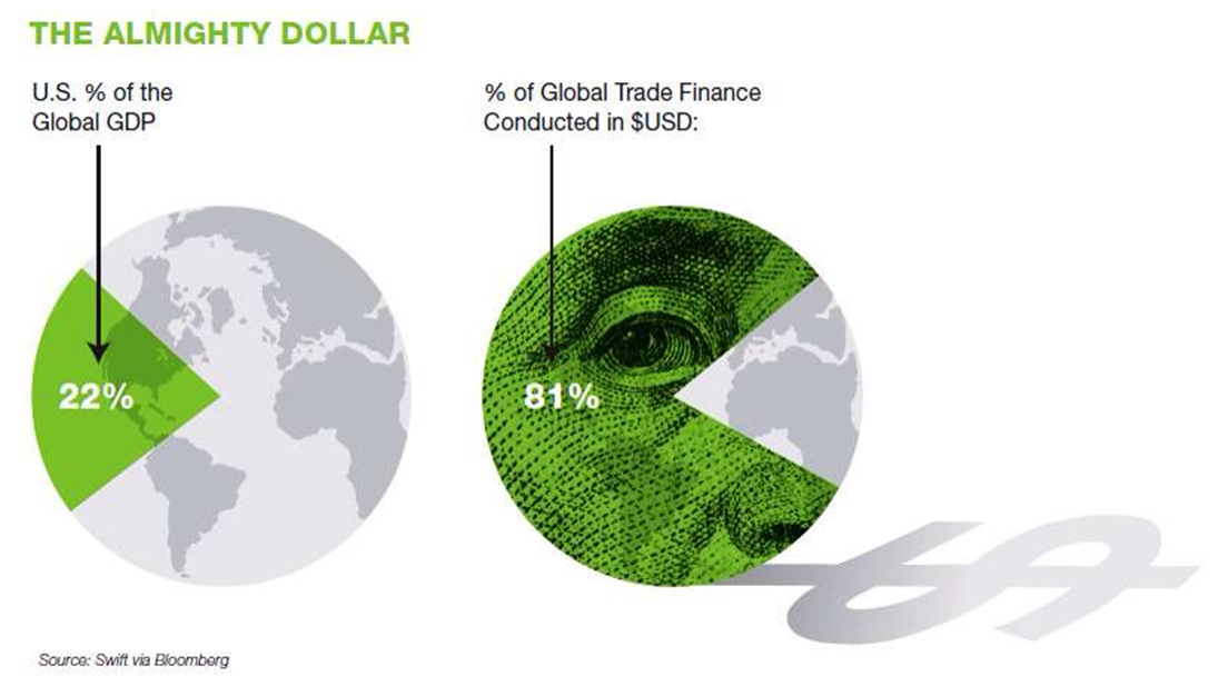 Доля ВВП США в мировом – 22%, доля доллара в международных расчетах – 81%, источник - Bloomberg.