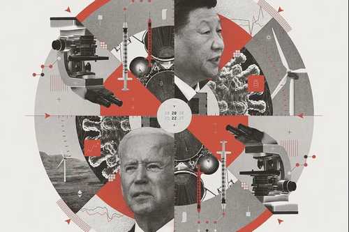 Ракетные сопла рядом с изображениями президентов США и Китая обозначают как ускорение космической гонки (в 2021 году Китай запустил в космос ракет больше, чем любая другая страна мира), так и скорость изменений в мире.