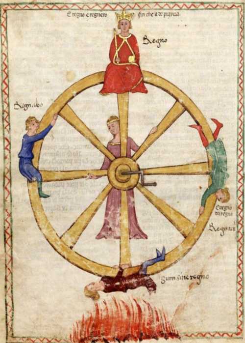 - к колесу Фортуны, которое неизбежно возвышает одних и ведет к упадку других (Си изображен выше Байдена, что соответствует нынешней тенденции - Восток поднимается, Запад снижается).