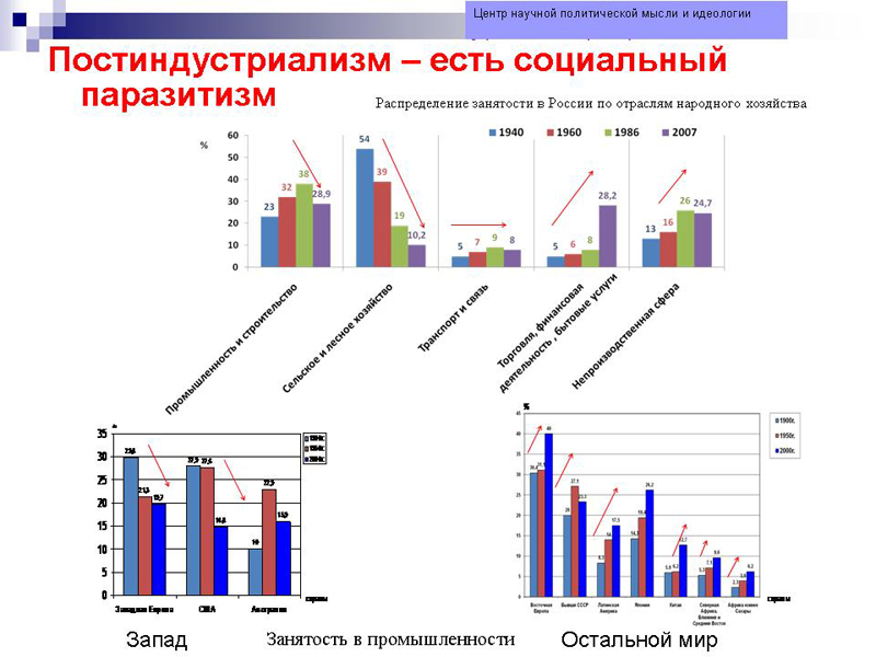 Постиндустриальная теория есть ложная и подставная теория и обычно ее упаковывают для подачи вполне определенным образом. Вот мол опережающим образом в передовых странах развивается третья корзина – сектор услуг. Но в нем, применительно к так называемым передовым странам, Соединенным Штатам, прежде всего, развита сфера финансовых отношений – торговля долларом, пирамида, где торгуют зеленой бумагой. Но дело в том, что материальное производство и американские капиталы выводятся в другие страны, производство перераспределяется по миру. Не уменьшаясь, а возрастая. В промышленном секторе растет и выпуск, и занятость. Рис.5. Если же брать пример США, страны мирового паразита, и переносить ее устройство ан Россию, то получается только часть результата, а именно, деиндустриализация, а вовсе никакая не постиндустриализация.