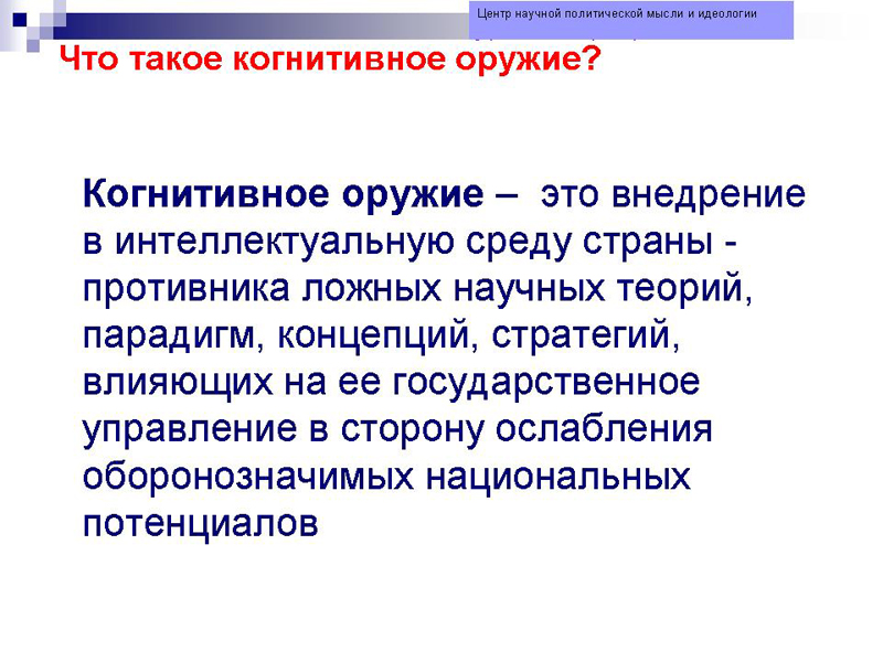 Когнитивное оружие – это внедрение в интеллектуальную среду страны противника ложных научных теорий, парадигм, концепций, стратегий, влияющих на ее государственное управление в сторону ослабления оборонно-значимых национальных потенциалов.