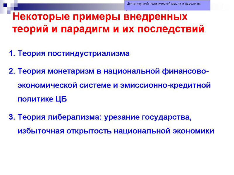 Три примера - теории постиндустриализма, теории монетаризма, теории либерализма – это еще не все, их гораздо больше. Это концепция опережения производительности труда по отношению к оплате труда (в условиях заниженной оплаты труда), это миграционная тематика, это тематика реорганизации контура образования и Российской академии наук и т.п.