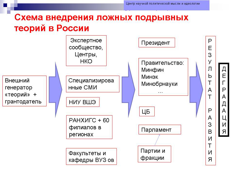 Три больших стрелки. Если мы понимаем картину, если она научно верифицирована, мы видим, что есть генератор ложных, подставных, подрывных теорий, мы видим те институты, общественные и государственные, через которые эти ложные теории поражают когнитивный потенциал страны, в том числе такие интеллектуальные империи как Высшая школа экономики, Российская академия народного хозяйства с 60 филиалами подготовки кадров по всей стране, которая добавилась в Академию государственной службы при президенте.