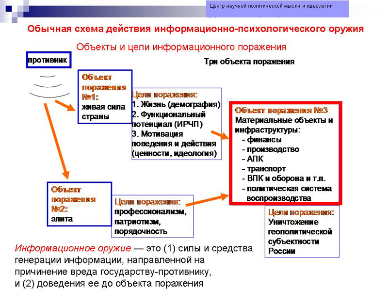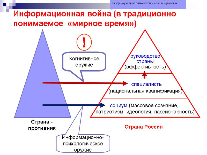 Но уже появилось следующее поколение методов воздействия на социум, на избранную страту общества, а именно страту элиты, страту специалистов. Специальными способами это пространство деквалифицируется, что, естественно, по вертикали воздействует на механизмы принятия национальных решений и нацелено, естественно, на ослабление государственно-управленческих и оборонных потенциалов страны. Эту цепочку проведенные исследования позволяют квалифицировать как специализированный метод, и мы его обозначаем как когнитивное оружие. Это есть тема нашего сообщения.