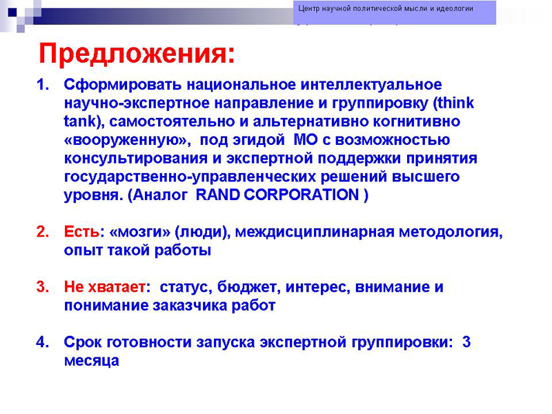1. Сформировать национальное интеллектуальное научно-экспертное направление и группировку (think tank), самостоятельно и альтернативно когнитивно «вооруженную», под эгидой МО с возможностью консультирования и экспертной поддержки принятия государственно-управленческих решений высшего уровня. (Аналог RAND CORPORATION).