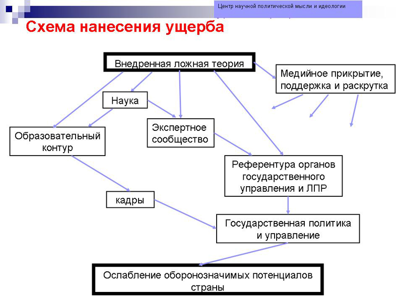 «Схема нанесения ущерба». Внедренная ложная теория поражает национальную науку, соответствующие научные школы и поколения. Производные от этого экспертные сообщества, образовательный контур, который готовит соответствующие ущербные кадры, запрограммированы на ложные представления о важнейших парадигмах управления, развития страны, воспроизводят поколения студентов и аспирантов соответствующего сорта. Они насыщают релевантные референтные структуры органов государственного управления и лиц, принимающих решения, соответственно, возникает ошибочная деструктивная государственная политика управления, и результат – ослабление оборонно-значимых потенциалов страны.