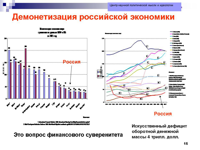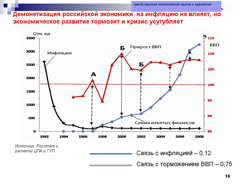 Модельные расчеты, эмпирика, феноменология уже почти по 20-летнему эксперименту, а это все с гайдаровских времен началось, показывают, что объяснение демонетизации российской экономики задачей подавления инфляции не проходит. Это ложное подставное объяснение, потому что связи между демонетизацией и индексом инфляции нет. Напротив. Если применить модель так называемых инфляционных весов, а не простенькое, для студентов, уравнение Фишера, связывающее денежную массу с валовым внутренним продуктом страны, то совершенно ясно, что в России сейчас, если ремонетизируют экономику, вводя собственные суверенные сотни миллиардов долларов в оборот, подпитывая федеральный бюджет, региональные бюджеты, то инфляция только упадет.