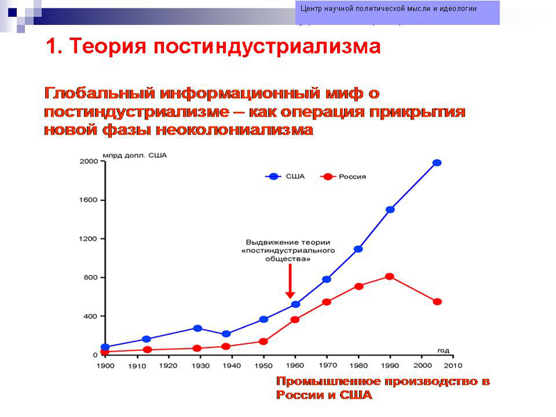 Эта теория разработана в 60-е годы, тогда, когда начали развиваться постиндустриальные, послепромышленные, после материального производства сферы интеллектуальной деятельности. Рис.4. Но достаточно легко показать, что после показанного стрелкой момента генерации этой теории в Соединенных Штатах Америки промышленное производство не прекращалось, а вот в Советском Союзе и России, вы видно, как бы завернулось вспять.