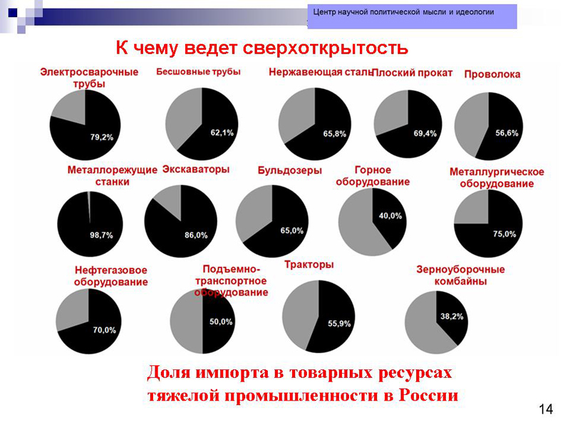 К чему это все приводит? Первое – деформируется отраслевая структура экономики страны. Второе – происходит вывоз капитала из страны. Вывод, а не получение внешних и частных инвестиций, к чему ведет постулат либеральной доктрины «сверхоткрытость». Это фактически десуверенизация страны в критических ее комплексах. Черные сектора на рис.13 – это доля иностранного капитала в отраслях.