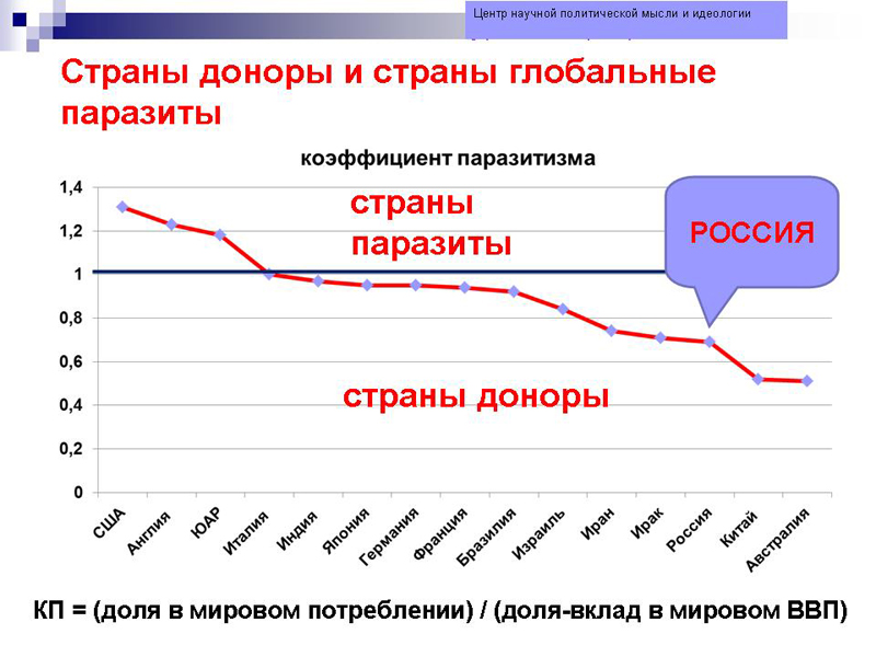 Страны, которые выше единицы на этом слайде, у них коэффициент отношения доли в мировом потреблении к вкладу в мировой ВВП выше единицы. Это страны-паразиты. Прежде всего, лидируют, конечно, Соединенные Штаты Америки. Россия и Китай, как вы видите, в противоположном конце этой классификации. И возникает простейший вопрос: а Россию допустят к состоянию мирового паразита, ей дадут возможность эмиссии рубля как резервной валюты в мире? Нет, конечно.
