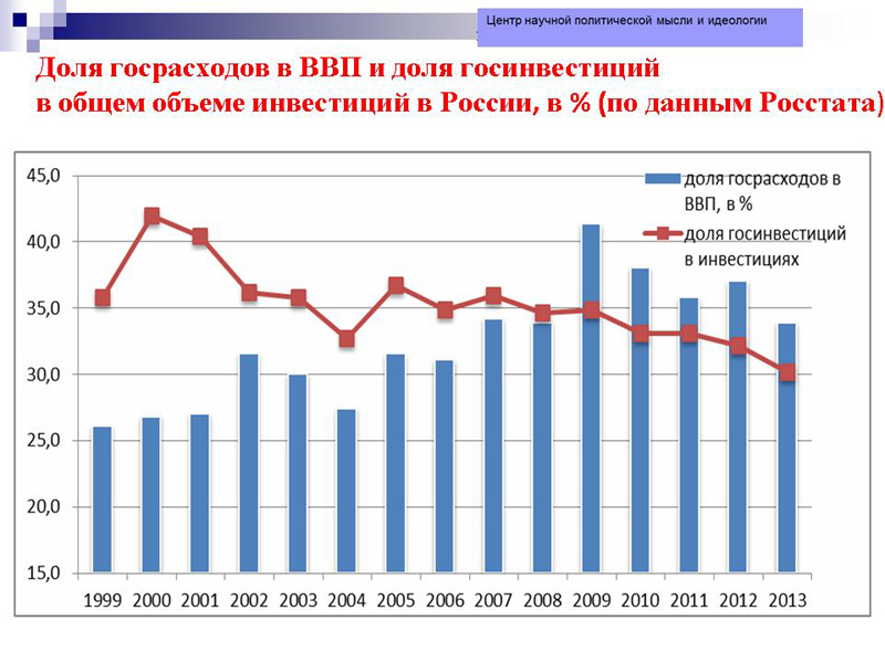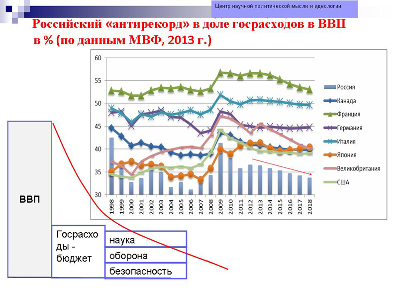 Пожалуй, самая фундаментальная, не только идеологическая, но и теоретическая доктрина, которая приобрела фактически статус официальной государственной доктрины, это теория радикального либерализма. Она не в расхожем, для медийной поддержки и раскрутки, обывательской формуле «свобода и права человека». Либеральная доктрина государства – это, прежде всего, формирование двух критически значимых показателей. Первый из них – это отношение госрасходов к ВВП. И второй показатель – это отношение объемов государственной собственности к имуществу всей страны. Рис.10-11.