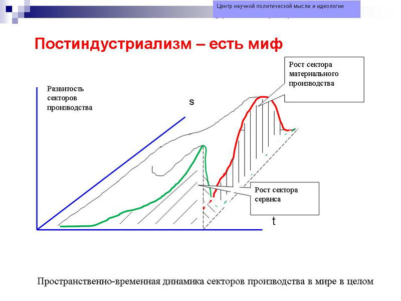 Результат навязывания мифа о постиндустриализме заключается в том, что страны Запада и США, сворачивая материальное производство, наращивают свое потребление, а материальное производство наращивается ими в других странах. А Россия сворачивает в стремлении к постиндустриализму материальное производство, сводя его к производству сырья, утрачивая свои потенциалы и государственный суверенитет.