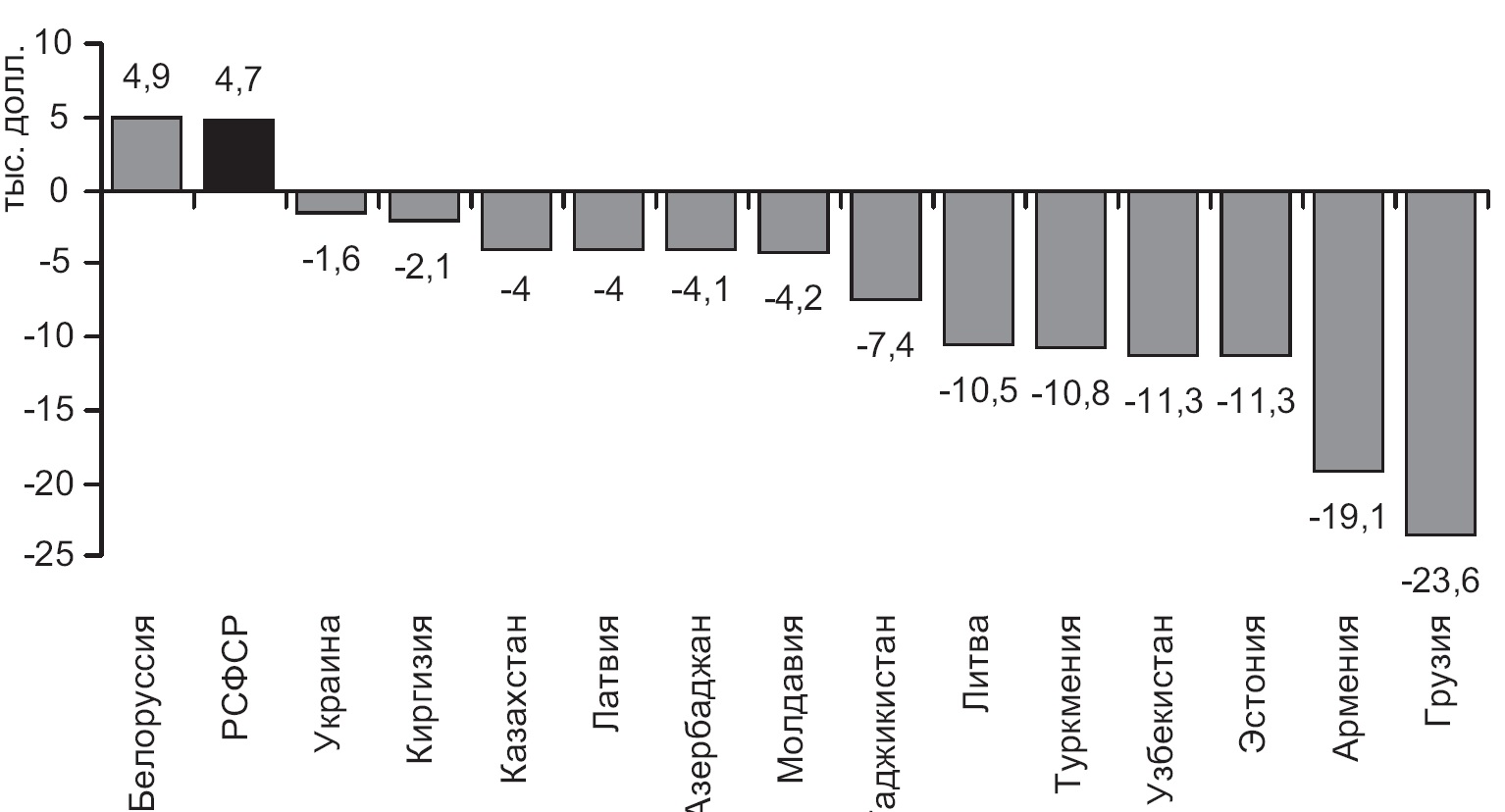 Рис. 1 Разность между производством ВВП на душу населения и потреблением по республикам СССР, тыс. долл. (1989 г.)
