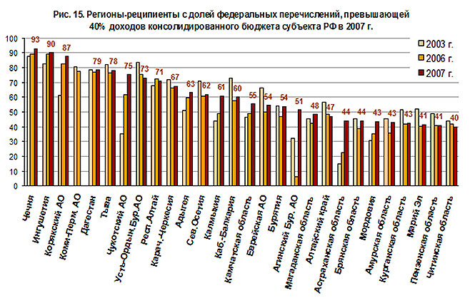 Хорошо известно, что львиная доля трансфертов федерального бюджета регионам России приходится на долю «национально-государственных субъектов РФ», то есть бывших автономных республик, областей и округов. Вот, например, график, который иллюстрирует соответствующие данные за 2007 год.
