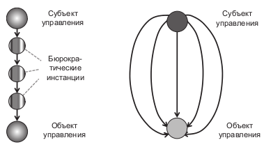 Итак, информационное общество предполагает распространение информации — сигналов системы управления — по всей сети общественной организации. Одновременно включается сразу несколько каналов воздействия. Перекрытие одного из них уже не приводит к технологическому сбою. Именно сетевая топология вместо простой вертикали представляет сущность нового управленческого механизма. Высвободиться из сетевого плена гораздо сложнее (рис.1).