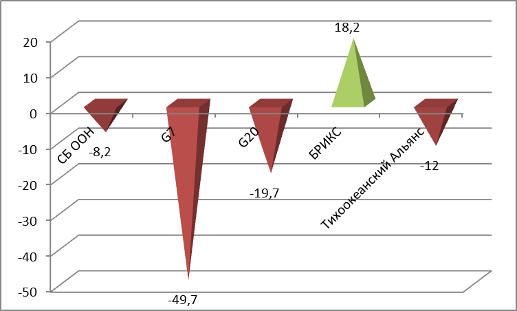 Еще одно важная задача, поставленная в данном исследовании, – выяснение того, как изменение отношения к России в 2014 году отразилось на распределении сил в пользу ее интереcов или против них в международных коллегиальных представительских институтах (СБ ООН, G8, G20, БРИКС).