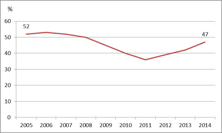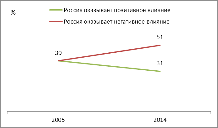 В 2014 году Международной службой BBC было проведено масштабное исследование, посвященное оценке характера влияния шестнадцати крупнейших государств на положение дел во всем мире. [4] В опросе приняло участие 24,5 тысячи человек из 24 стран, включая Россию. Нужно отметить, что проводился опрос в период с 17 декабря 2013 года по 28 апреля 2014 года, то есть еще до развития украинского кризиса и частично совпадая с проводимой в Сочи Олимпиадой. В результате исследования выяснилось, что в половине стран отношение к России ухудшилось. Причем, если по сравнению с предыдущим годом негативное восприятие России увеличилось на 4 пункта, то сопоставление данных, полученных за весь период проведения мониторинга (с 2005 года), показывает потерю реноме уже на 12 пунктов (рис. 3).