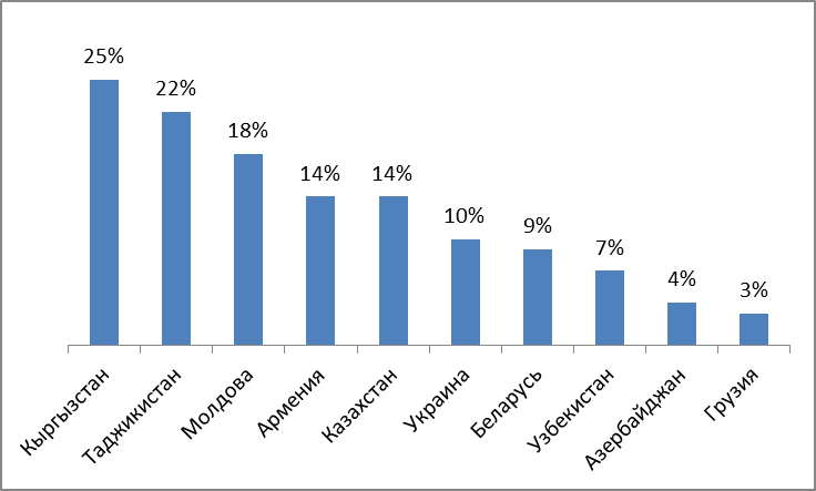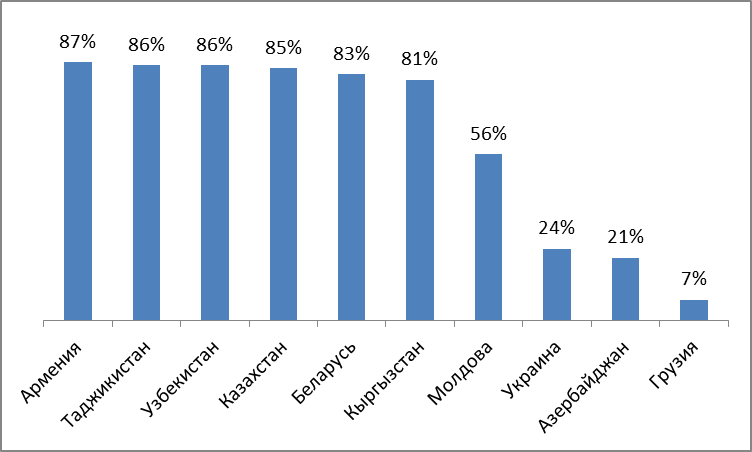 Мнения о том, дружественным ли государством является Россия, распределились таким образом – большинство населения бывших республик СССР считают, что РФ настроена дружелюбно по отношению к их стране, но Украина, Азербайджан и Грузия придерживаются иной точки зрения. Наиболее настороженные оценки дали жители Грузии (рис. 24).