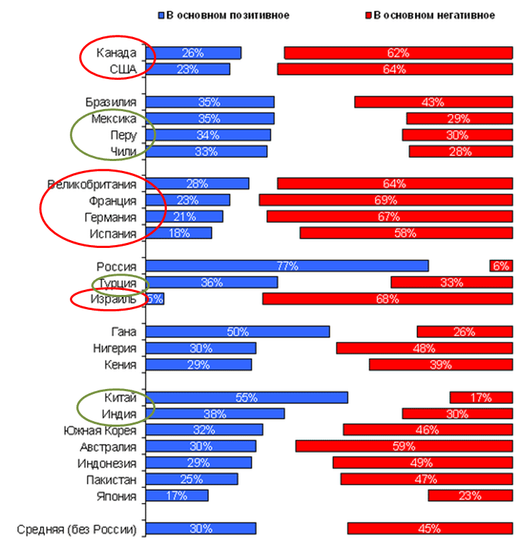 Приведенные исследования, по результатам которых делается вывод о тотальном ухудшении имиджа России в мире, нельзя рассматривать в качестве «последней инстанции» хотя бы потому, что они были проведены американскими компаниями, в выборку которых вошли далеко не все страны. Это вполне естественно для социологических исследований, но вывод об эскалации негатива в отношении России во всем мире все-таки преждевременен без учета мнений жителей стран постсоветского пространства, без анализа взглядов граждан ряда стран Латинской Америки, которые данные исследования, к сожалению, игнорировали.
