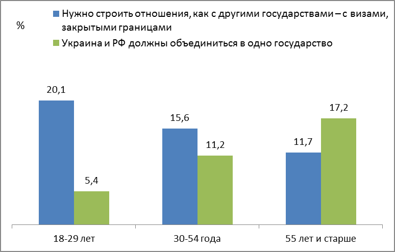 Рис. 21. Распределение ответов граждан Украины о предпочтительных отношениях с Россией по возрастным группам. [10]