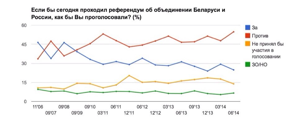 Белорусы в большинстве своем поддержали претензии России на Крым и признали процесс его присоединения законным. Почти каждый второй уверен, что Россия оказывает положительное влияние на Украину. [11] Эти оценки указывают на позитивное восприятие гражданами Белоруссии образа и влияния нашей страны. Однако динамика в целом, хотя и носит непостоянный характер, все-таки показывает рост дистанцирования белорусов от России – с 2006 года численность граждан Белоруссии, выступающих против объединения наших стран, увеличилась в 1,5 раза. Конечно показатель, отражающий доли сторонников и противников объединения Белоруссии и России, является косвенным, но некоторую ясность в динамику распространения анти- или пророссийских настроений все же вносит (рис. 22).
