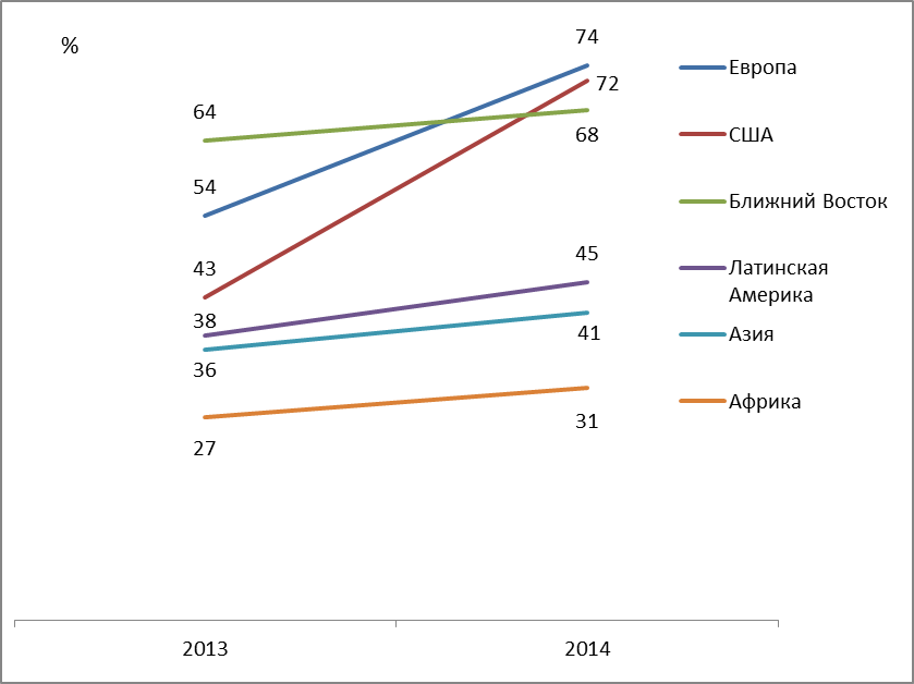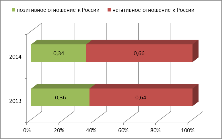 Американские социологические службы констатируют факт, что отношение к России в 2014 году существенно ухудшилось и ситуация принимает «драматический» характер. Наиболее существенные сдвиги в сторону русофобии наблюдаются в Европе и США (рис. 1).