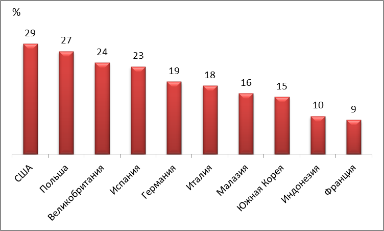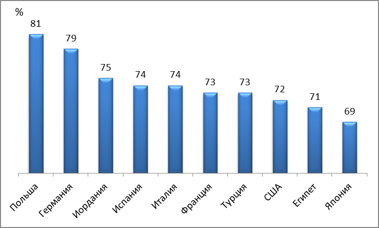Рис. 7. Десятка стран с наиболее негативным отношением к России (% населения, отме-тившего, что у них сложилось неблагоприятное мнение о России).