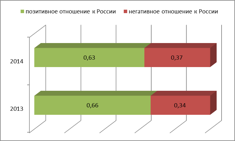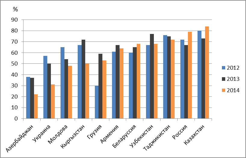 Отношение к России на постсоветской территории можно косвенно увидеть на основе оценки населения стран бывшего СССР Таможенного Союза. Для граждан государств, не являющихся членами ТС, вопрос звучал следующим образом: «Считаете ли Вы, что нашей стране желательно присоединиться к Таможенному Союзу?». Для граждан государств-членов ТС– «Как Вы относитесь к решению объединить Россию, Казахстан и Беларусь в Таможенный Союз?» [12]. Сравнивая данные за 2012, 2013 и 2014 год, делаем вывод о том, что больше всего поддерживают эту идею Казахстан, Таджикистан Узбекистан и Белоруссия. Меньше всего – Азербайджан и Украина. В этих же странах наблюдаются наиболее сильные подвижки в сторону негатива по сравнению с предыдущими годами.