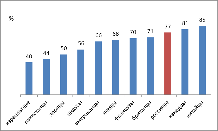 Крайне скромны в этом отношении японцы, израильтяне и пакистанцы – доля тех, кто оценивает влияние своих стран на мир как позитивное, не превышает 50%. Хотя такие показатели или культурно обусловлены или связаны в большей степени с неприятием населением милитаристских амбиций своих властных элит. Рекордсменами в этом вопросе предсказуемо стали китайцы, 85% которых считают значение Китая в мире положительным (рис. 6).