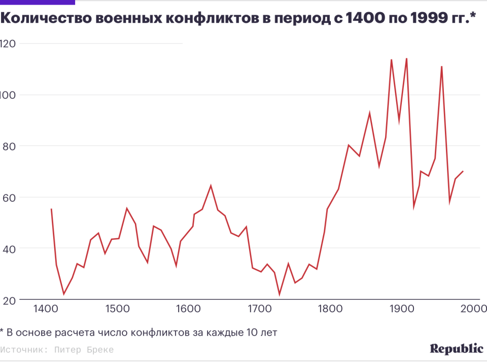 Но то спокойствие, внушаемое графиком, увы, очень обманчивое, полагает профессор Университета Огайо Бэар Браумюллер. Невозможно делать выводы о риске войн, основываясь на сравнении итогов минувших конфликтов, не учитывая систему международных отношений, которая действовавала в каждом из исследуемых периодов. Ведь увеличение числа игроков на международной арене вносит сложности в межгосударственное взаимодействие, что приводит к повышению вероятности вооруженных столкновений. Особенно чрезвычайно критичным это упущение кажется для первых двух третей ХХ века, в течение которых в мире драматически увеличилось количество независимых государств. «В мире, где есть лишь два государства, может произойти лишь одна война, но если стран уже четыре штуки, то существует уже шесть возможных осей конфликта», – поясняет Браумюллер. Профессор Технологического института Джорджии Питер Бреке насчитал 3708 конфликтов за 600 лет и проследил их динамику. Из нее видно, что за последние два столетия войн стало намного больше.