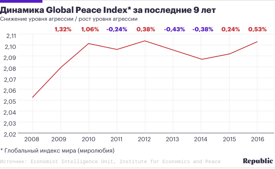 В 2008 году, согласно динамике Глобального индекса «миролюбия», мир был куда безопаснее, чем в 2016-м.