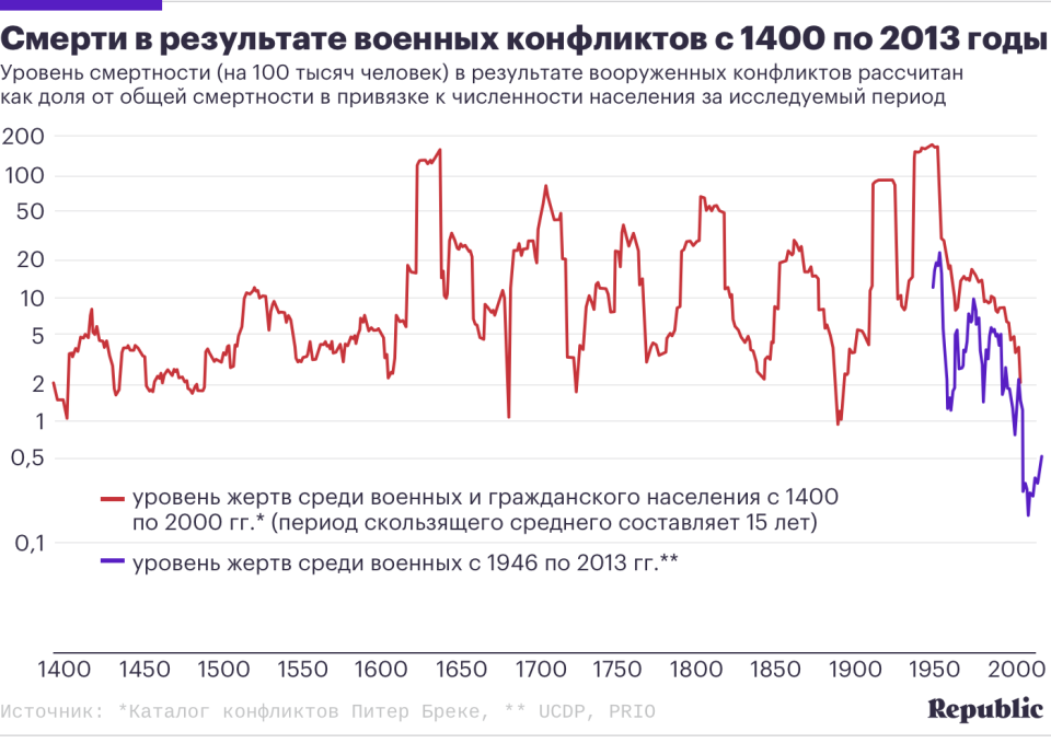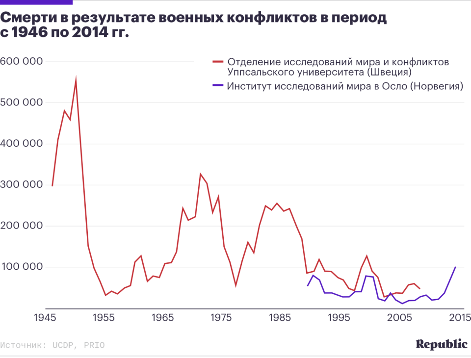 График, который составило Отделение исследований мира и конфликтов Уппсальского университета (Швеция) и Институт исследований мира в Осло (Норвегия), наглядно демонстрирует, что после Второй мировой войны уровня насилия снизился.