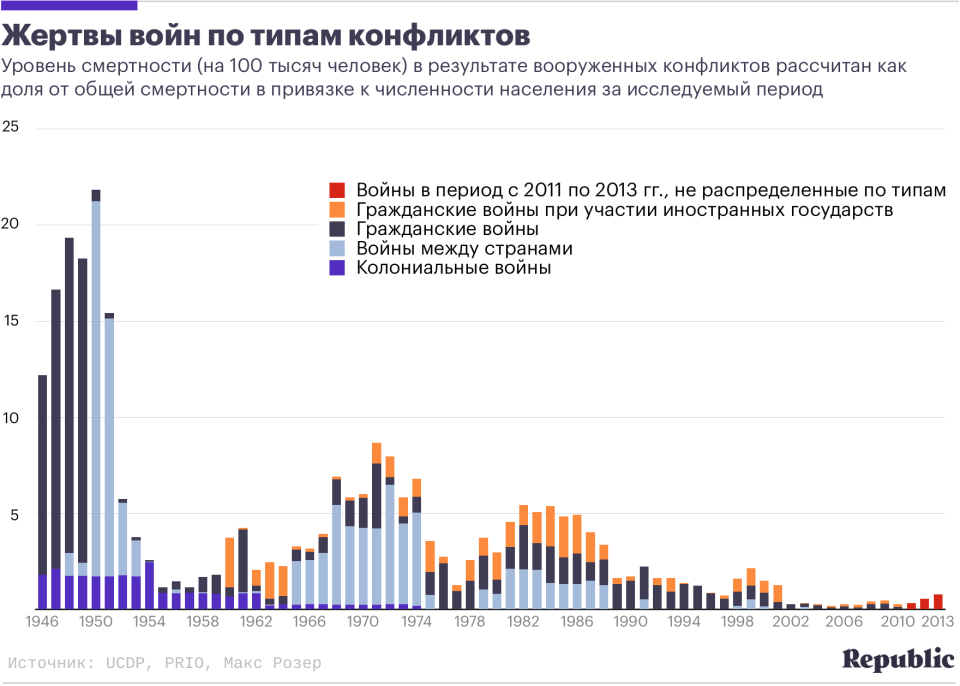 Как показал оксфордский экономист Макс Розер, за последние десятилетия, характер вооруженных конфликтов также изменился: сошли на нет колониальные войны, стало меньше, чем гражданских войн между государствами, – в среднем не столь кровопролитных, если верить другим данным, которые приводит экономист.