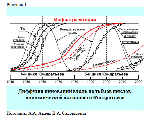 Мировые кризисы возникают при смене длинных волн экономической конъюнктуры и заканчиваются «штормом инноваций», прокладывающих дорогу становлению нового технологического уклада. По мере перетекания остающегося после коллапса финансовых пузырей капитала в производства следующего цикла будет формироваться новая длинная волна подъёма экономической конъюнктуры. Именно в подобные периоды глобальных технологических сдвигов возникают «окна возможностей», позволяющие отстающим ранее странам вырваться вперёд, совершив «экономическое чудо». Для этого необходим мощный инициирующий импульс, позволяющий сконцентрировать имеющиеся ресурсы на перспективных направлениях становления нового технологического уклада и опередить другие страны в развёртывании системы производства/потребления (и сбыта) хотя бы части ключевых для него товаров и услуг.