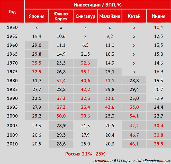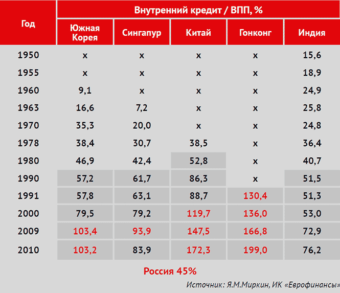 Наиболее узким местом, затрудняющим реализацию стратегии опережающего развития, является отсутствие механизмов внутреннего долгосрочного дешёвого кредита. Международный и наш собственный исторический опыт осуществления успешной структурной перестройки экономики свидетельствуют о необходимости резкого увеличения объёма инвестиций для своевременного становления нового технологического уклада. Главным источником финансирования этого роста инвестиций является соответствующее расширение внутреннего кредита (табл. 2).