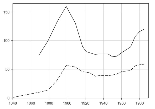 Рис. 4. Спрос на высшее образование. Количество медицинских (сплошная линия) и зубоврачебных (пунктир) институтов в США.